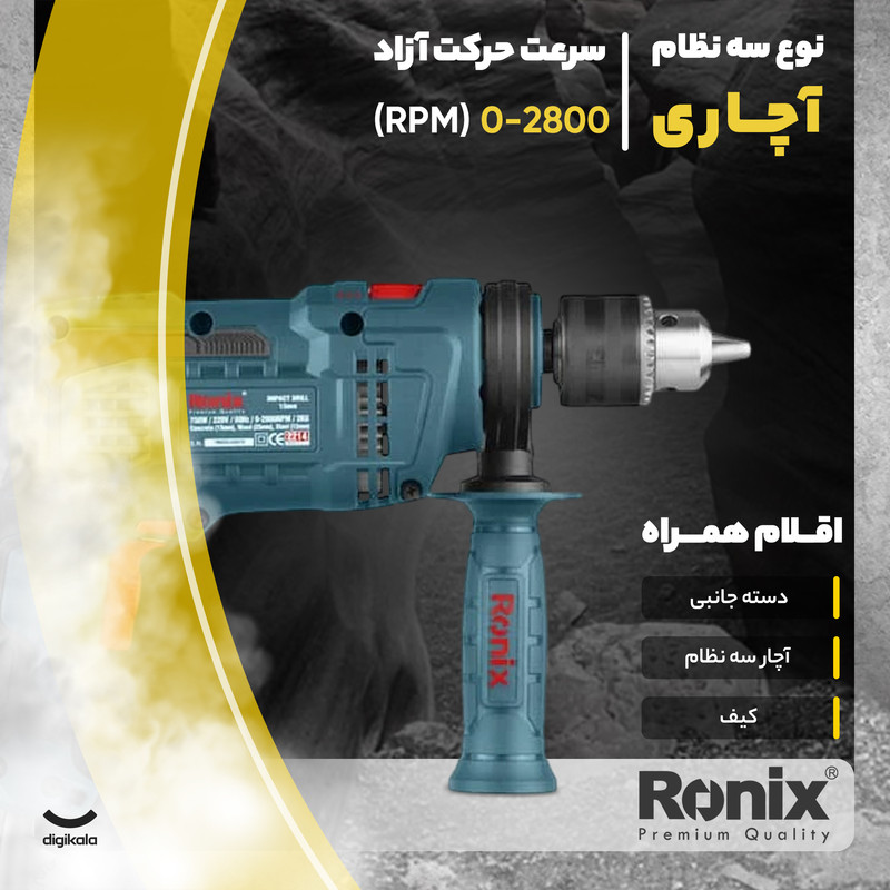 این دریل مجهز به موتور قدرتمند ۷۵۰ وات با سرعت گردش متغیر تا ۳۰۰۰ دور در دقیقه است. قابلیت چکشی آن امکان سوراخکاری در بتن را به سادگی فراهم میآورد. همچنین، سهنظام فلزی ۱۳ میلیمتری با قفل سریع، تعویض متهها را بسیار آسان میکند.