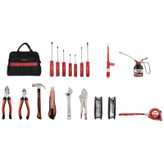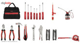 اگر قصد تهیهی مجموعه ابزاری ساده و کارآمد دارید محصول فوق پاسخگوی نیازهای شما خواهد بود. این مجموعه 19 عددی از ضروریترین ابزارهای کار برخوردار است. شرکت «رونیکس» (Ronix) برای این مجموعه 3 پیچ گوشتی دوسو و 4 پیچ گوشتی چهارسو با سری آهنربایی و قابلیت کوبش پذیری درنظر گرفته است تا بتوانید بسیاری از پیچهای دوسو و چهارسو را باز و بسته کنید. برای پیچهای دیگر نیز 8 پیچ گوشتی ستارهای و 8 آچار آلن طراحی شده است. فازمتر این مجموعه طولی 18 سانتیمتری دارد و دامنه ولتاژ آن 500-100 ولت است. انبرهای این مجموعه نیز شامل سیمچین، انبردست و انبر قفلی میشوند که به ترتیب طولی برابر 16.5، 19.5 و 23 سانتیمتر دارند. از دیگر ابزارهای کاربردی که برای هر کیف ابزاری ضروری است کاتر، آچار فرانسه، متر و چکش را میتوان نام برد. شرکت رونیکس نیز به این موضوع توجه داشته است. آچار فرانسه این مجموعه 10 اینچی بوده و چکش و کاتر آن بهترتیب طولی برابر 28 و 17 سانتیمتر دارند. طول نوار متر فلزی آن نیز 5 متر بوده و از قفل، استپر و سری آهنربایی برخوردار است. برای روغنکاری قطعات نیز روغندانی فلزی با ظرفیت 200 میلیلیتر عرضه شده است. این مجموعه درون کیف ابزاری برزنتی با 35 محفظه قرار دارد که از بند و فریم فلزی دور دهانه سود میبرد.