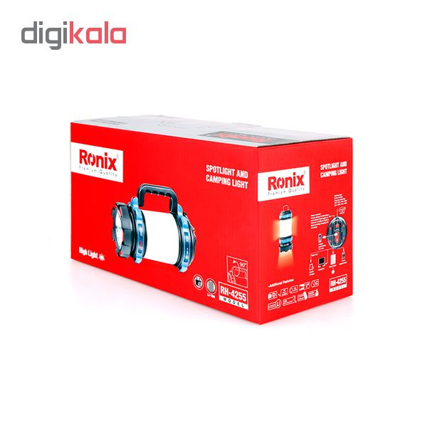 نورافکن جدید رونیکس مدل RH - 4255 یک نورافکن کامل از تمامی جهات میباشد ، این نوافکن در حالت بالا با برد 1200 متر و دارای قسمت نوردهی بر روی بدنه بوده که میتوانید از این نور در داخل خانه یا چادر و کمپ به راحتی استفاده کنید و همچنین این نورافکن دارای حالتهای مختلف روشنایی بوده در جهت کم مصرف بودن باتری و میزان زمان بیشتر روشنایی. همچنین از این نوافکن در جهت شارژ کردن وسایل الکترونیکی نیز میتوانید استفاده کنید ، در واقع یک پاور بانک به همراه دارید .