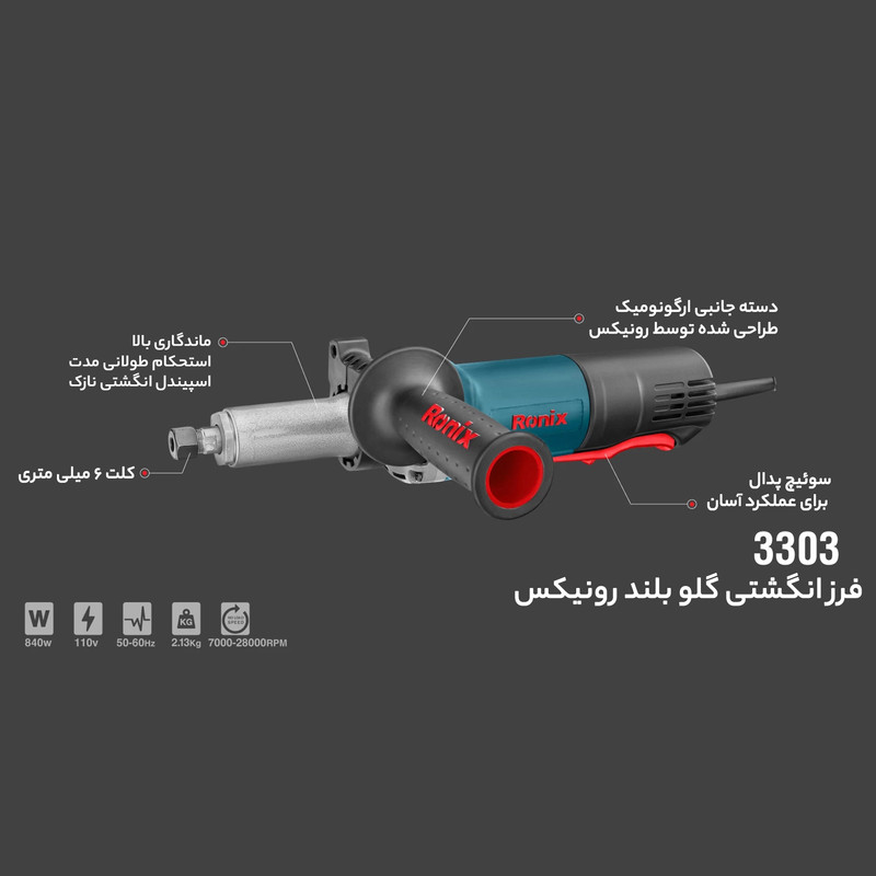 فرز انگشتی به یک موتور گیربکسی مجهز است؛ بدنه ظریف و کوچکی دارد و با توجه به اندازهی شفت خروجی آن، در دو مدل گلو بلند و گلو کوتاه تولید میشود. برای انتخاب فرزهای انگشتی باید به سرعت دورانی، سرعت برش و نوع متریال قطعهی کار توجه کنید. از فرز انگشتی گلو بلند 6 میلیمتر 840 وات رونیکس مدل 3303، برای کارهای صنعتی و همچنین، ظریفکاریهای هنری استفاده میشود. فرزکاری فولاد، قطعات سرامیکی، لوله، سطح مقطع میلههای فولادی، آجر یا کاشی، منبتکاری و کارهای نجاری با کمک این ابزار قدرتمند به سادگی و با سرعت بالایی انجام میشود. از انواع سریهای مختلف در این دستگاه برای انجام حکاکی، طراحی، سوراخکاری، شیارزنی و ... استفاده کنید. فرز انگشتی گلو بلند 3303 رونیکس، شفت خروجی بلندتری نسبت به فرزهای گلو کوتاه دارد؛ فرزکاری در مکانهای با دسترسی دشوار را راحتتر انجام میدهد؛ قدرت مانور و تسلط بیشتری را برای افراد ایجاد میکند و وزن کم آن، مانع از خستگی دست کاربران در استفادههای طولانیمدت میشود.